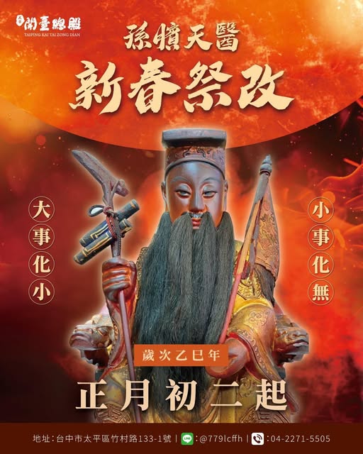 太平開臺總殿將舉辦 「新春祭改」 儀式,由本殿【孫臏天醫】親臨主法,以「孫臏法」為信眾祭改,掃除舊年厄運、祭送流年災星,庇佑新的一年 大事化小、小事化無、平安順遂。